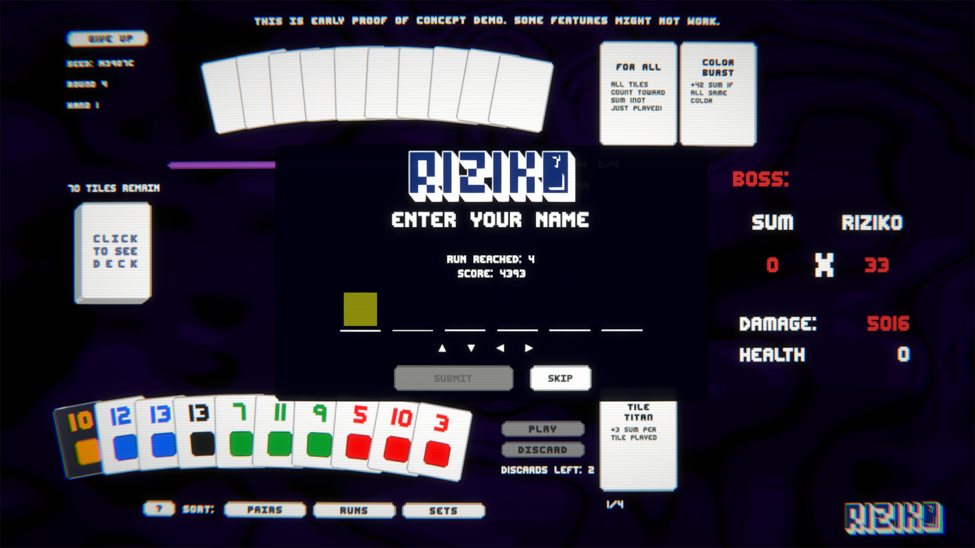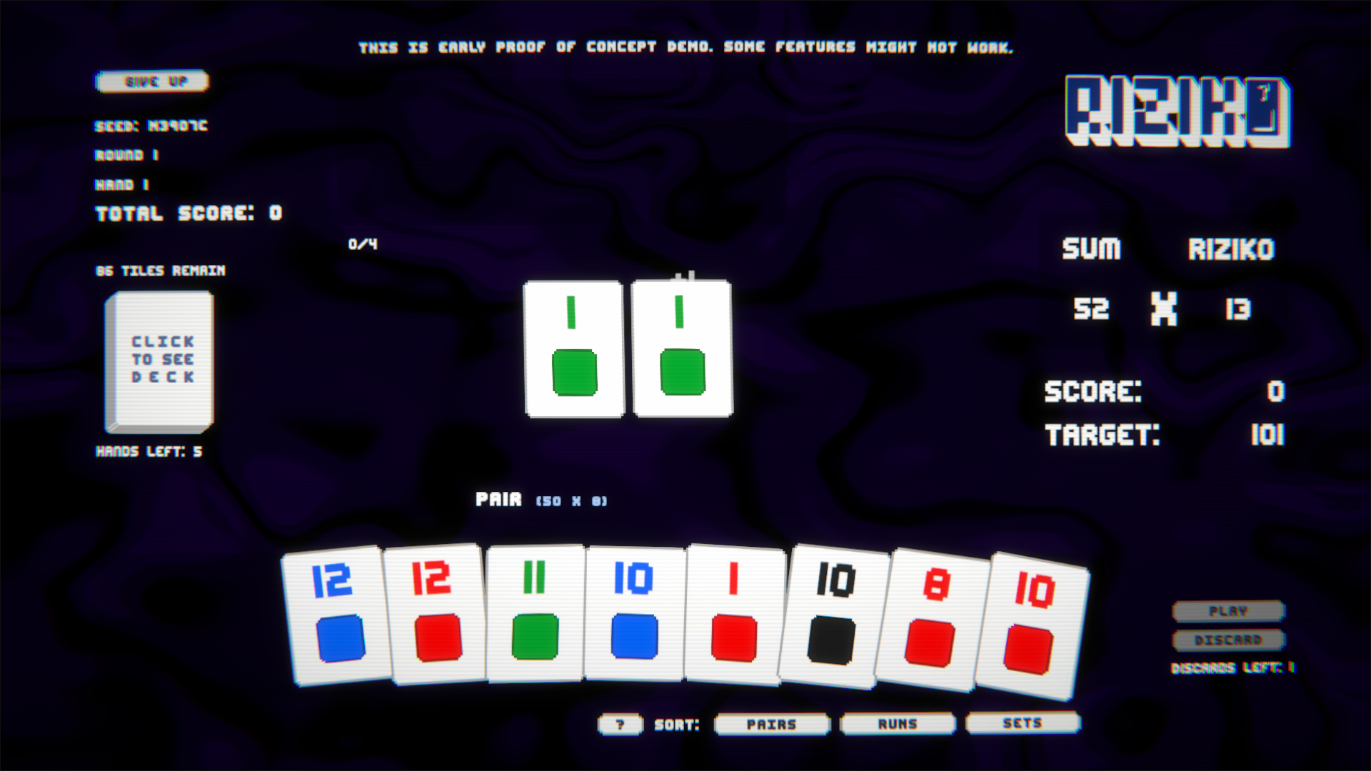 Riziko takes the classic tile-matching mechanics of Okey 101 and Rummy and injects them with high-stakes roguelike deck-building. Build your hand, calculate your risks, and break the bank before the Boss breaks you.